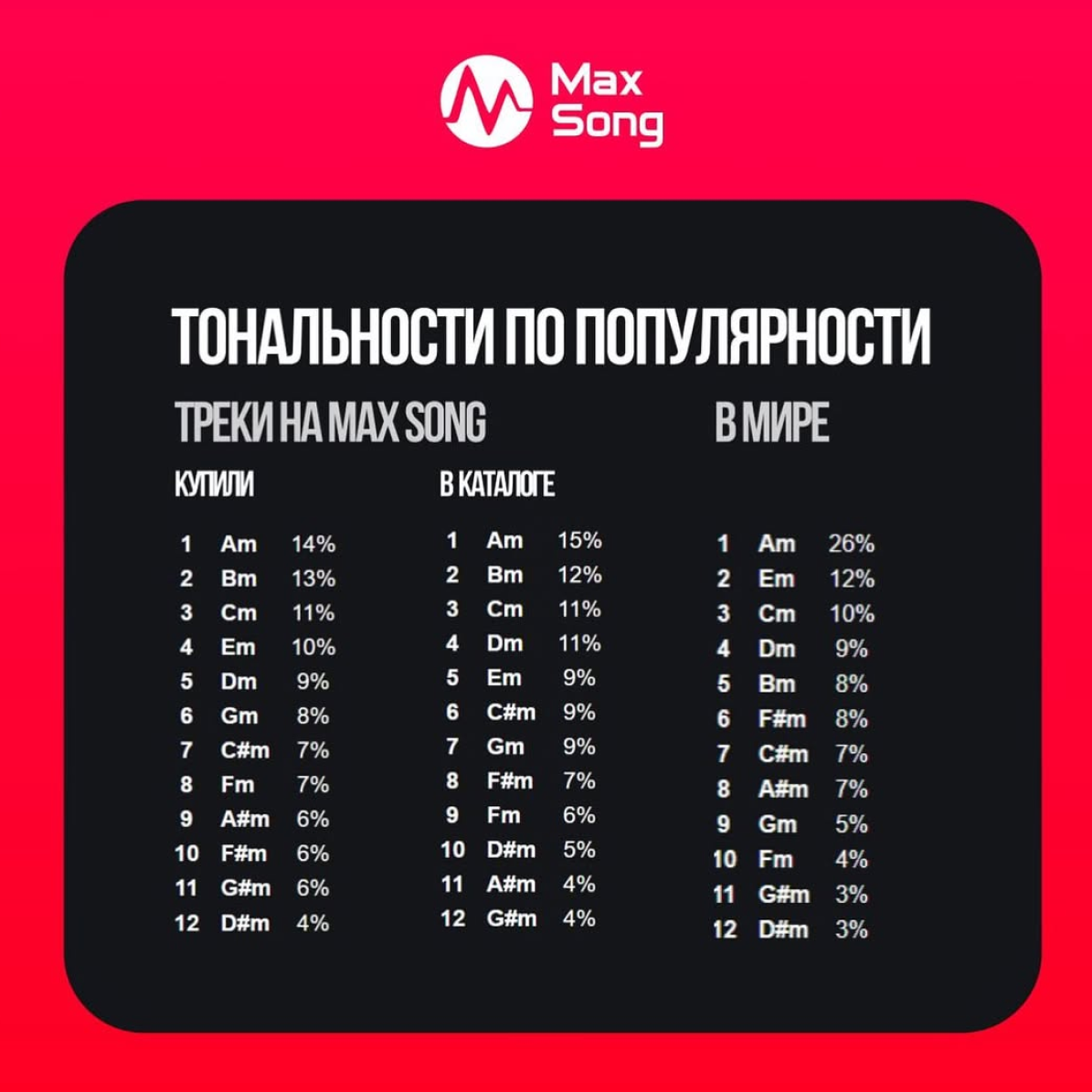Я чаще всего пишу в Bm. У нас на сайте эта тональность на 2ом месте по популярности, а вот в мире она на 4 позиции ниже. Как думаете, почему? Мое предположение, что это связано с разными тесситурами голосов в разных регионах. Но все равно, это странно.